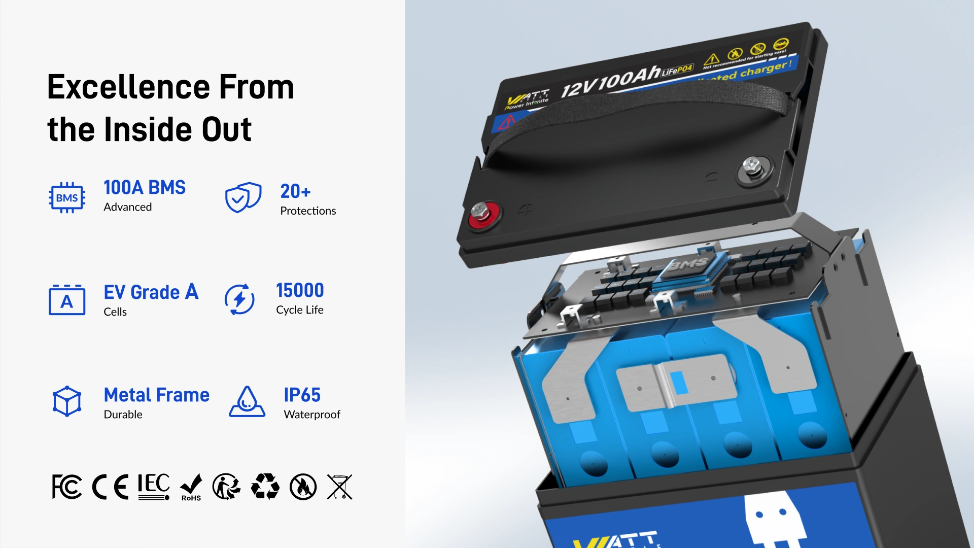Wattcycle LiFePO4 lithium battery is committed to creating the best quality batteries to solve users' deep needs. Excellent performance inside and out, the outer shell is waterproof and shockproof, the internal metal frame improves stability, 100A BMS 100% guarantees battery safety, and high-quality cells ensure excellent performance and ultra-long life.