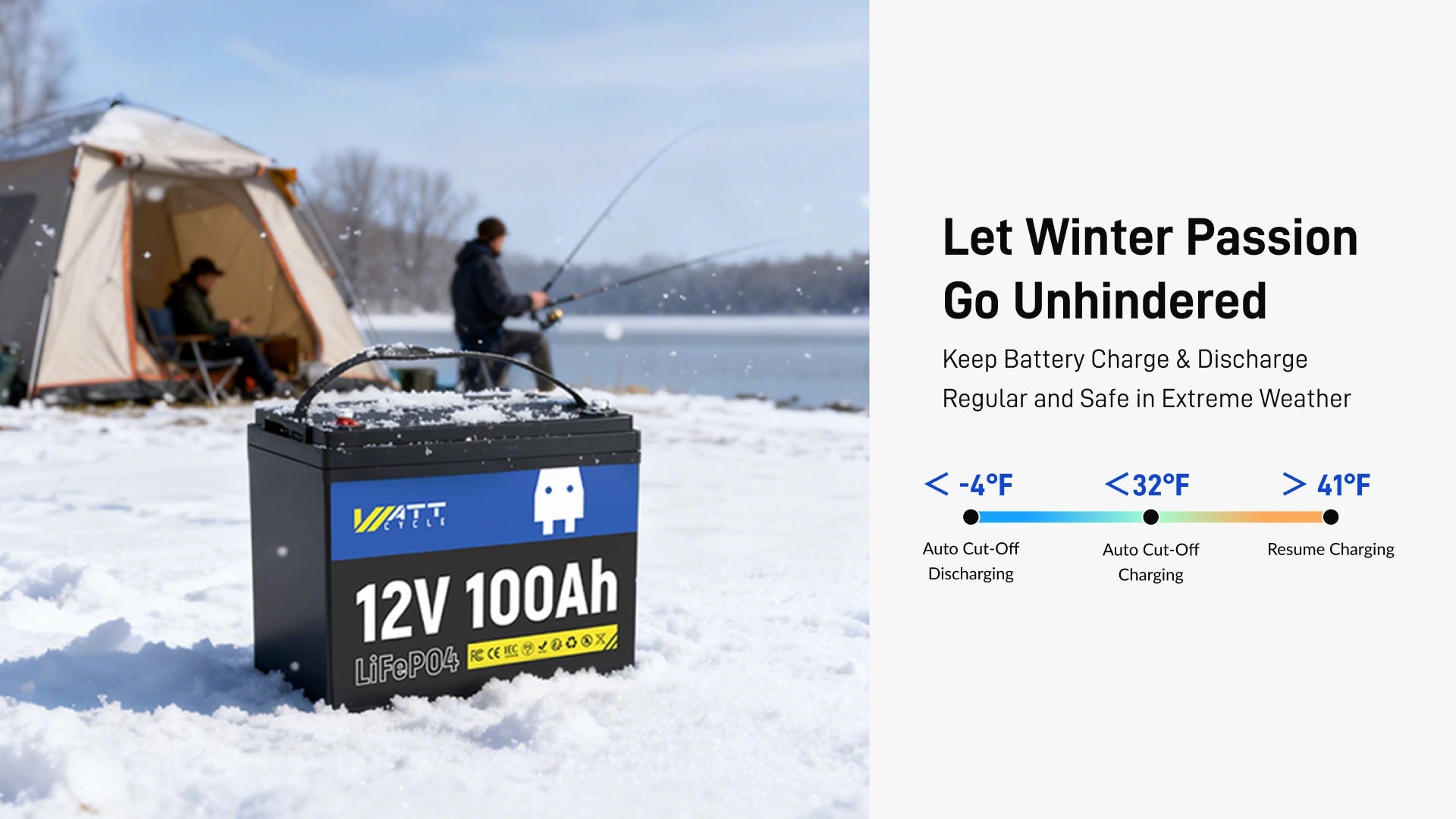 Afraid that extreme weather will hinder the normal charging and discharging of batteries? Worried that the battery can't guarantee safety in bad weather? Wattcycle lithium battery provides the ultimate solution. It can keep discharging at -4℉ to 158℉ and charge normally at 32℉ to 122℉. Out of ranges, it can automatically stop charging and discharging to ensure battery safety.