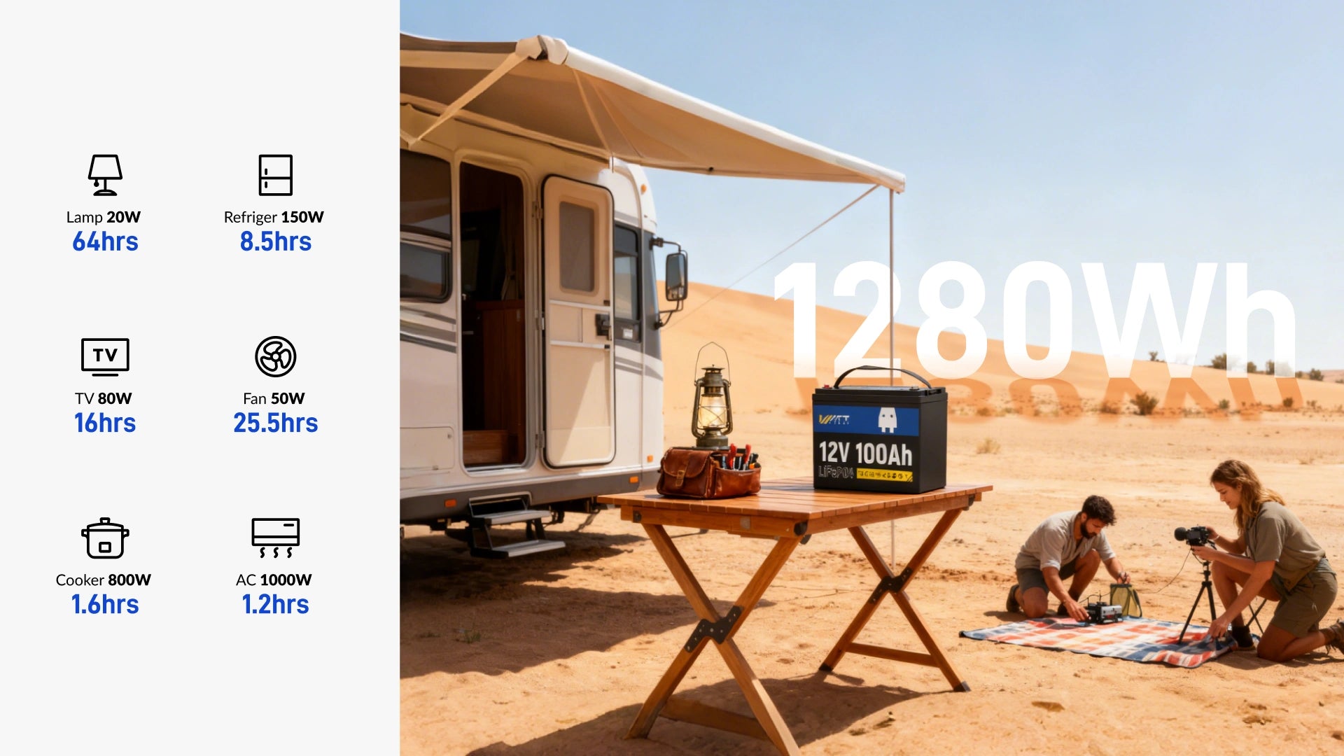 One piece can provide 1280Wh of energy, which can easily meet the power supply for RV travel. Supporting the maximum 1C discharge rate, Wattcycle RV battery features fast charging to realize uninterrupted power supply.