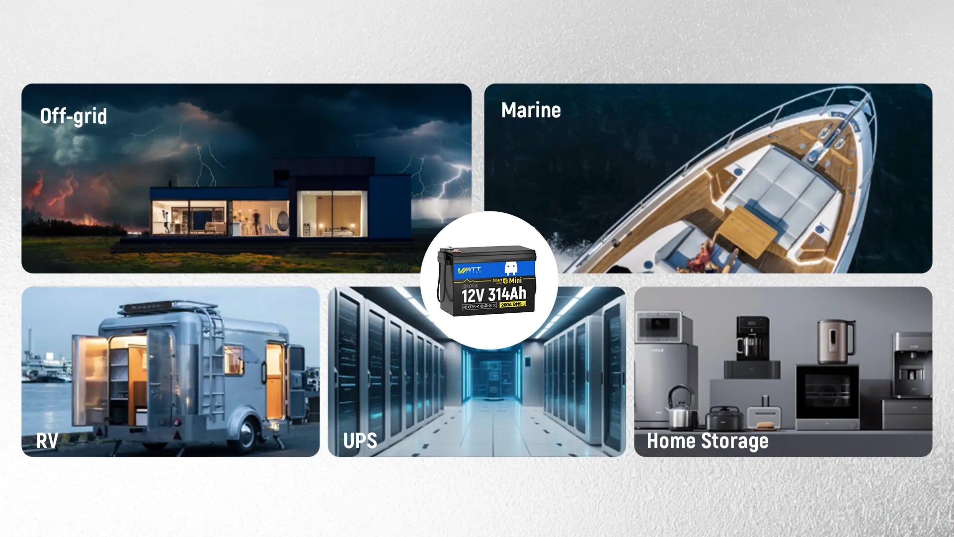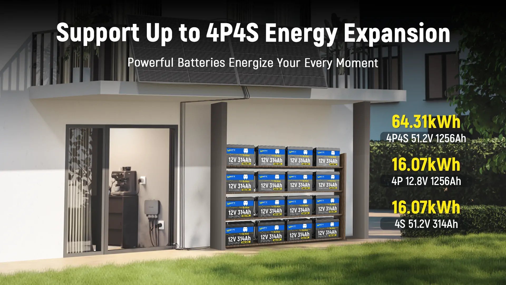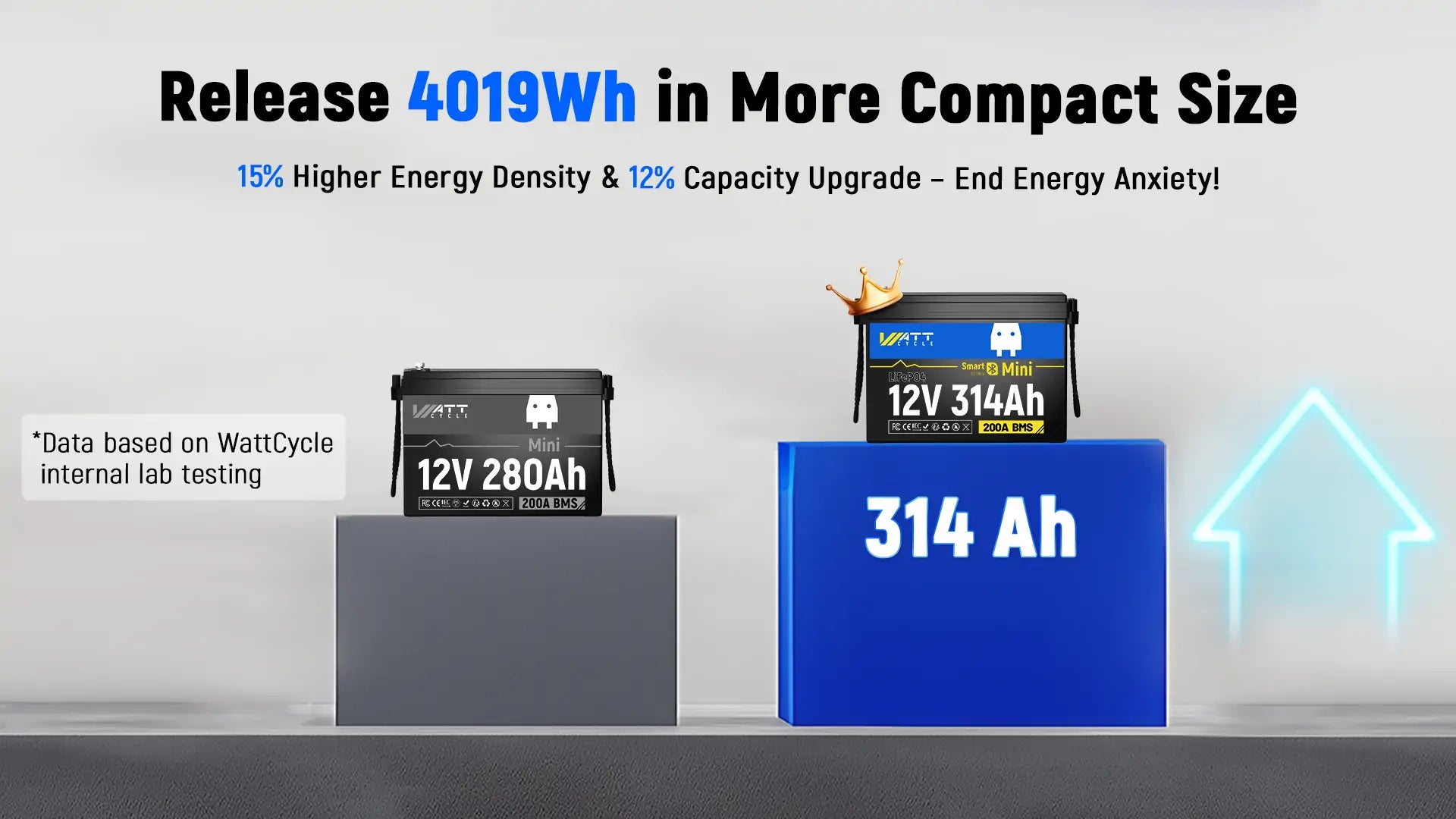 WattCycle 12V 314Ah LiFePO4 Battery delivers 4019Wh energy, higher than three 12V100Ah lithium batteries connected in parallel—ideal for RVs, solar systems, home storage, trolling motors, and marine. Support Max. 4S4P to 64.307kWh—hassle-free ENERGY anxiety