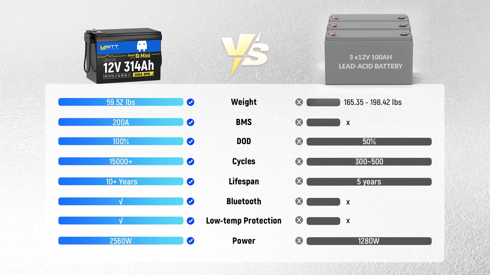 For those running three 12V 100Ah batteries in parallel, you’d typically combine to 300 Ah. That setup adds weight, wiring complexity, and more points of failure. By choosing one WattCycle 314Ah MINI battery instead. you get additional benefits.