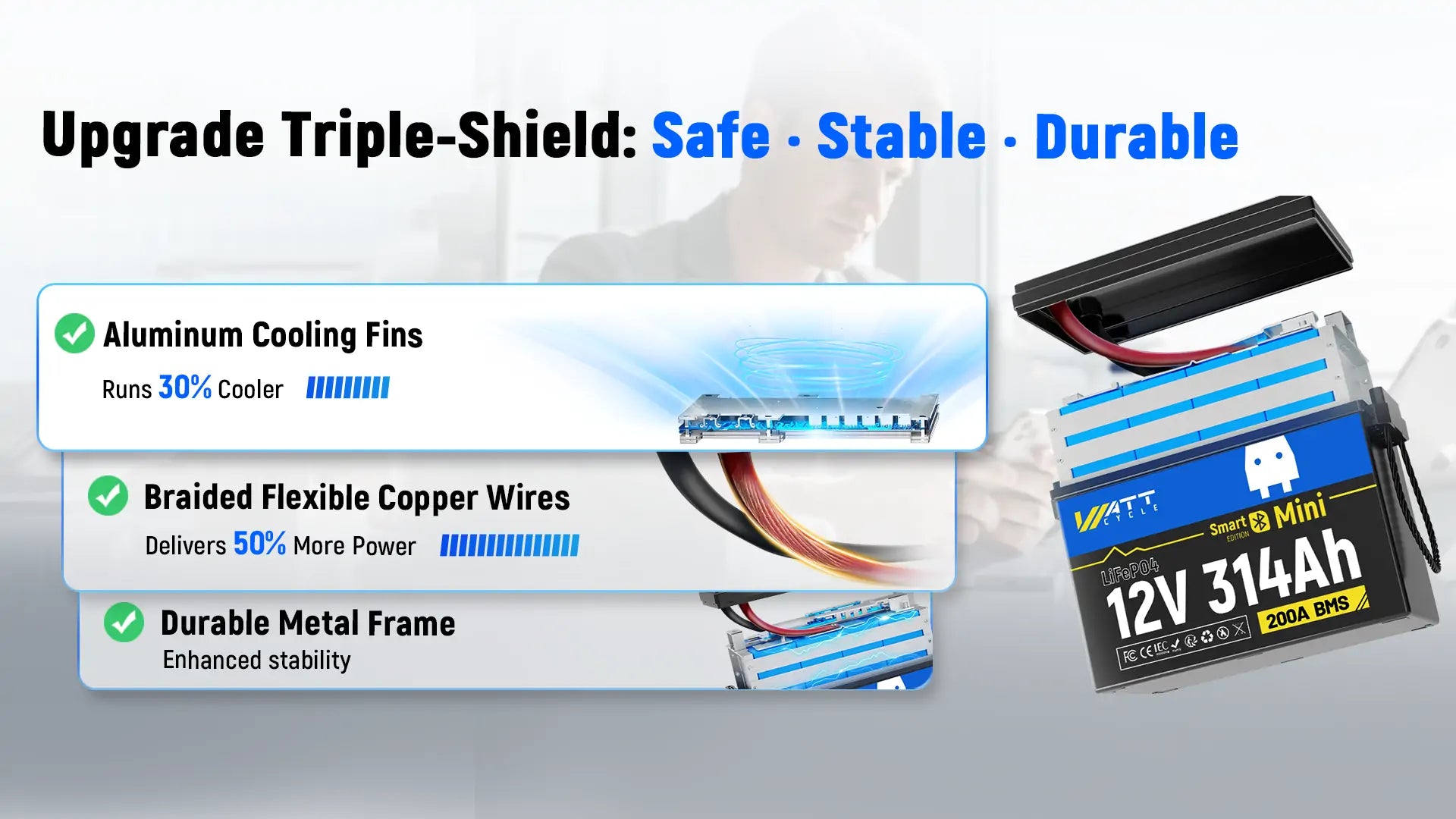 The WattCycle 12V 314Ah LiFePO4 Battery stands up to harsh conditions thanks to its unique full-aluminum internal frame,Which not only reinforces the cell structure but also integrates cooling fins that improve heat dissipation by 30 %. That means during heavy discharge or rapid charging, excess warmth is whisked away faster—protecting cell health and maintaining peak performance. Meanwhile, braided copper wires have been newly added inside the battery, enabling it to provide more than 50% of the power with the minimum voltage drop. This three-tier design makes it one of the safest 12V 300Ah deep cycle battery options on the market.